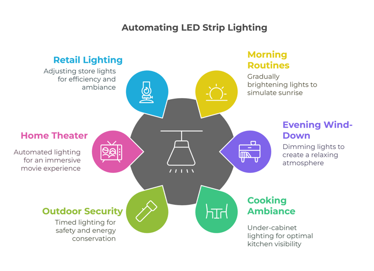 Outdoor Lighting for Security: Schedule outdoor LED strips to light up at dusk and turn off at dawn to ensure safety and conserve energy.