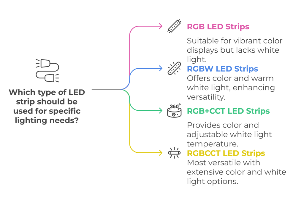LED strip lighting has revolutionized the decoration of spaces by giving us vibrant, energy-saving, and customizable lights. The most common types are RGB, RGBW, RGB+CCT, and RGBCCT LED strips, which differ in their capabilities of mixing colors and controlling brightness. RGB strips mix red, green, and blue to produce an infinite amount of colors, whereas the addition of white in RGBW is added mainly for intensity and better white light strong. RGB+CCT and RGBCCT extend adjustable color customization to include color temperature adjustment to set the mood. Understanding these differences ensures that you can make the right choice based on your requirement-whether that is home lighting, commercial display lighting, or immersive entertainment.